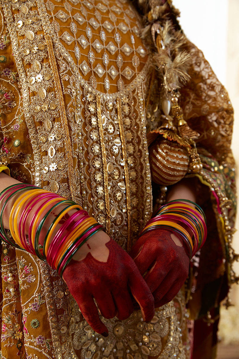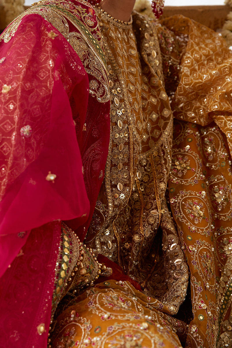 Sajal poses away in Kesari, rustic shades of mustard packed with a punch of our signature atishi gulabi. It features a lose fit Kashmiri phiran style kameez doused in a beautiful jaal of embroidered floral vines and carefully placed signature motifs enhanced by hand embellished accents of gota, hand cutsequins, pearls and cutdana . It comes with a generously embroidered sharara with heavy borders and an atishi gulabi dupatta with a delicate spray of floral motifs framed with chunky embroidered borders with dainty paisleys and geometric lines.