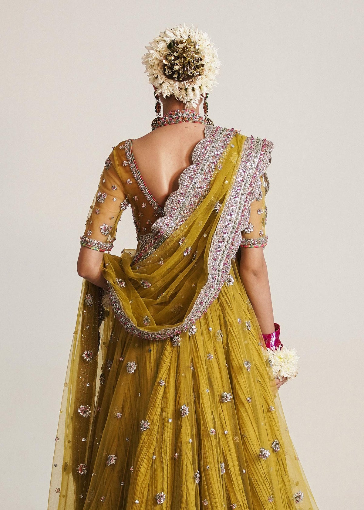 A spectacular lime yellow net peshawas with an embellished choker neck attached to intricately detailed front. The panels of peshwas are covered with beautiful chatta of small sequin bunches. The border of peshwas is made in a beautifully designed pattern which is also intricately detailed with adda work.