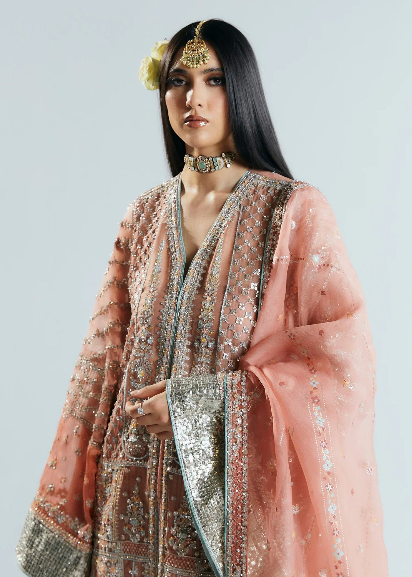 This silhouette brings a modern charm to your wardrobes with its pastel peach and orange color blocking. Further it features crushed sharara adds a texture, with embellished border paired with screen printed dupatta with four side heavy embellished borders.