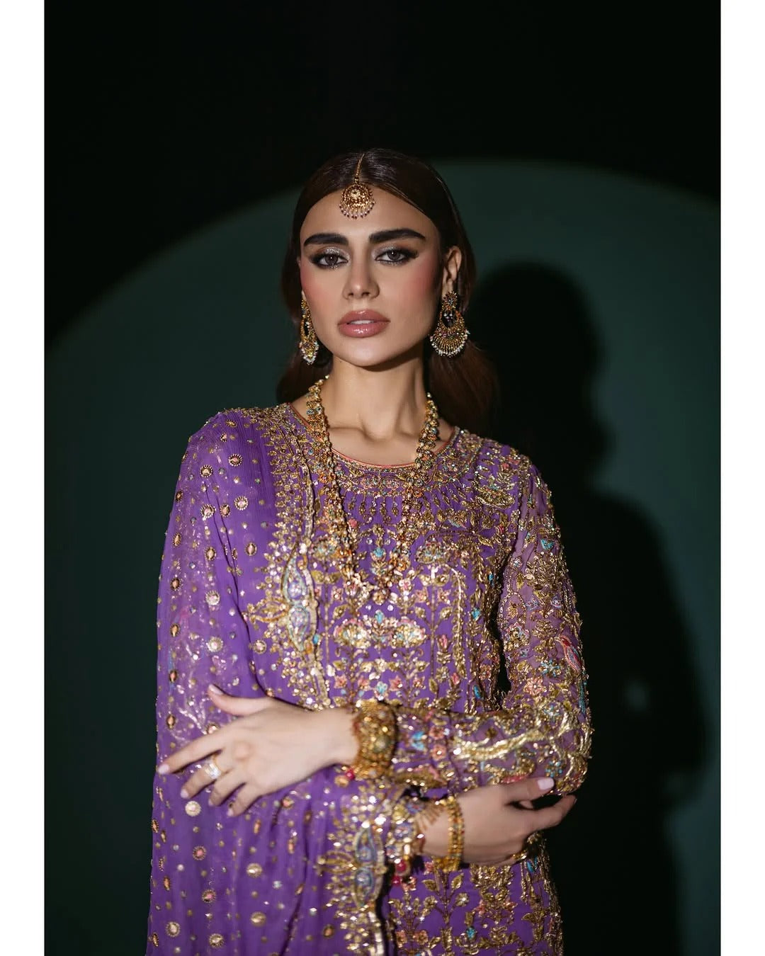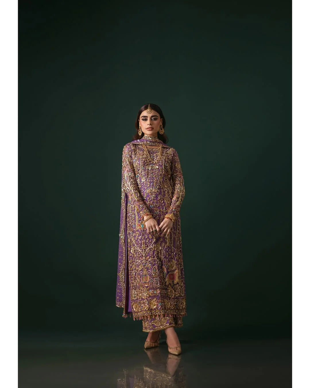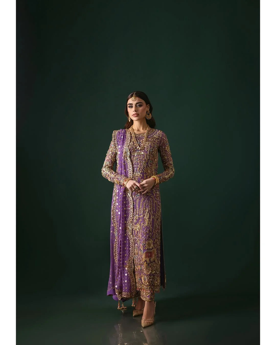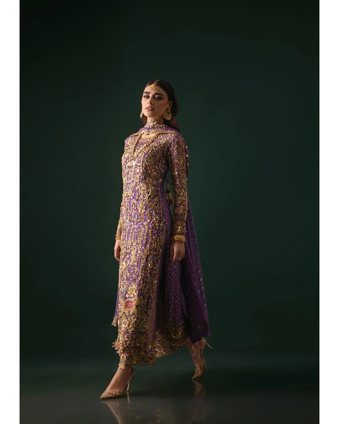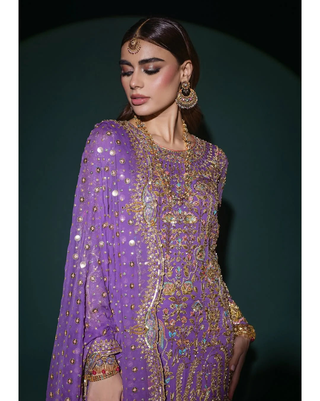 To enhance the fusion touch of the ensemble, it is complemented by a Zainab Salman signature ruffle jacket, which adds a dramatic and contemporary twist to the traditional heavily embroidered attire. For a traditional finish, this exquisite piece can be paired with a pure net dupatta, further elevating its elegance.