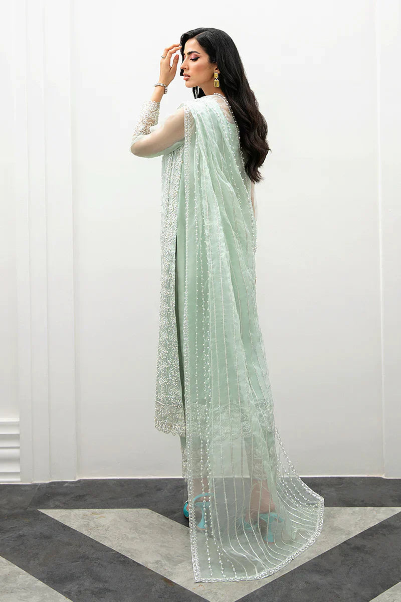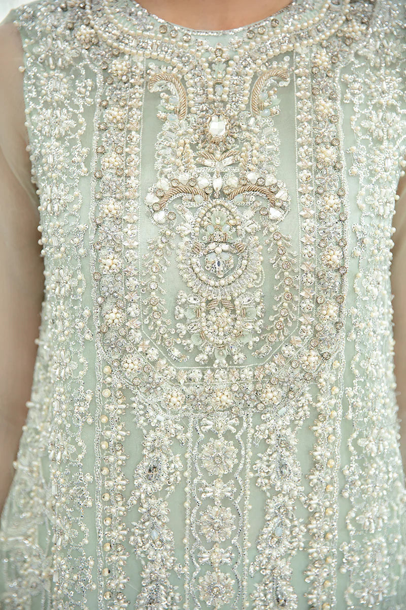 Crafted on the purest organza, essayed in the most ravishing hues of mint green "Liana" is a true work of art. Curated to the highest standards of perfection and finesse, Liana's glamour is enhanced by the enticing hand work and embellishments done on the entire shirt front and dupatta.