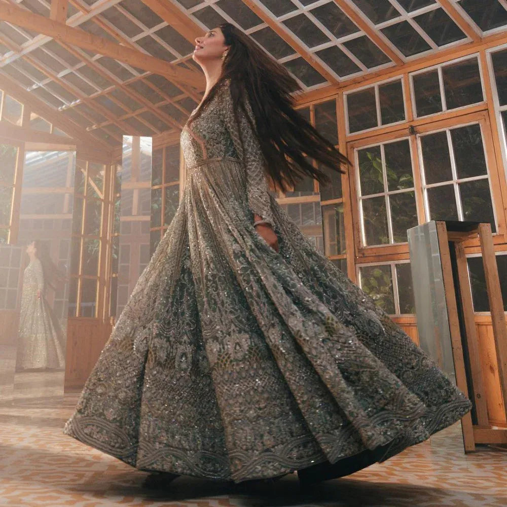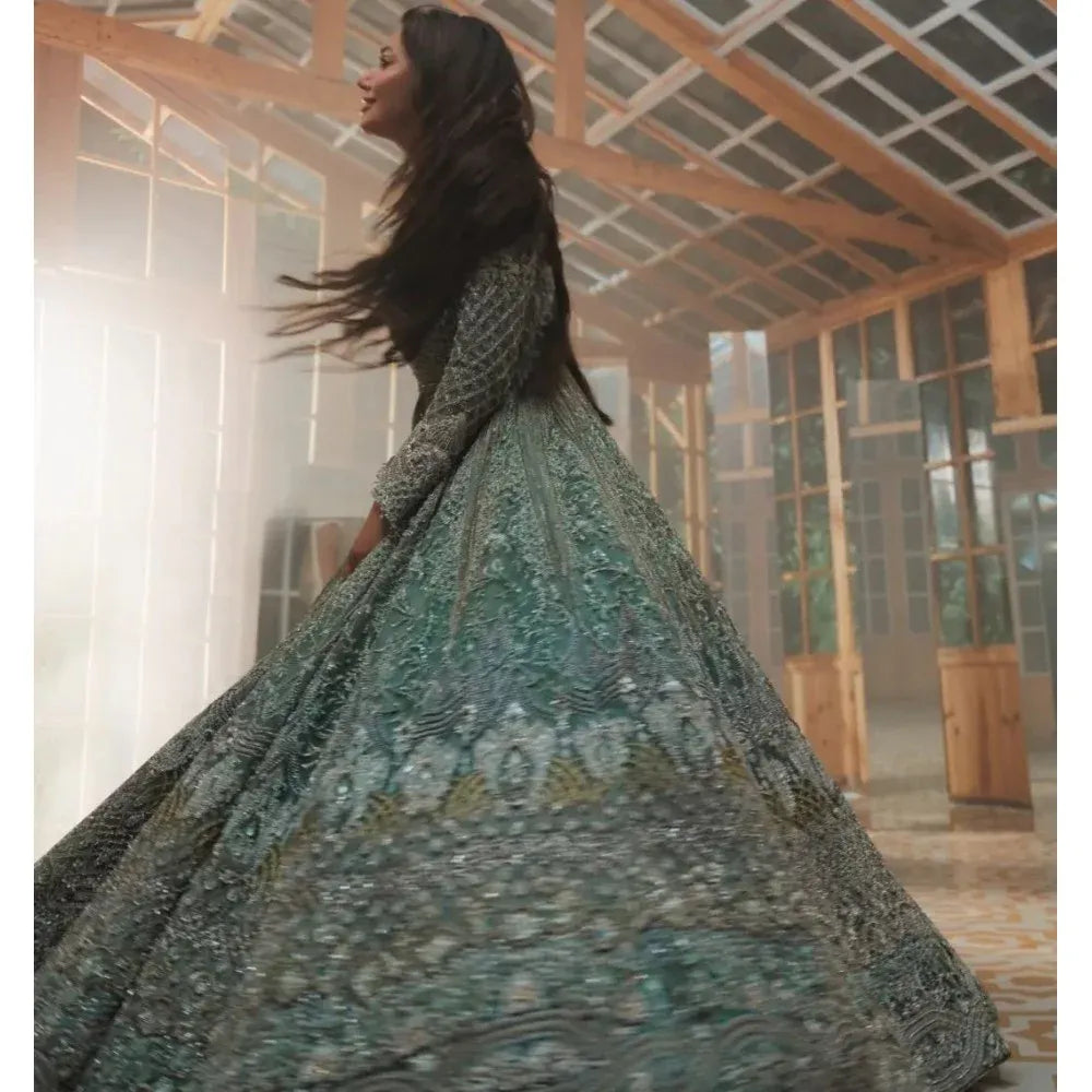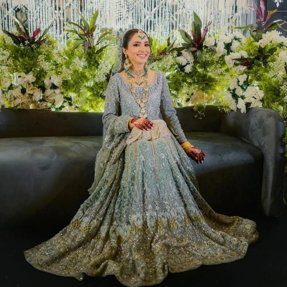 Completing the ensemble is a zari net dupatta in the same pewter blue hue, meticulously adorned with intricate borders and delicate sequins work. This addition adds a touch of celestial splendor to the entire attire, making it perfect for Pakistani designer lehenga choli enthusiasts seeking elegance and grace for their special day.