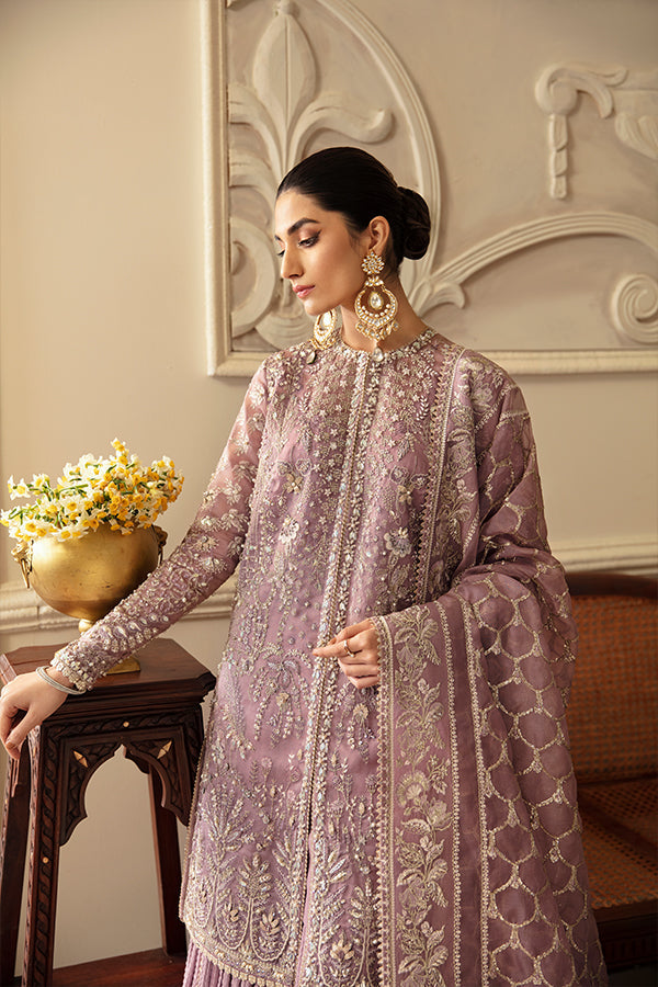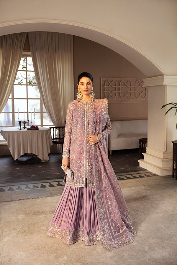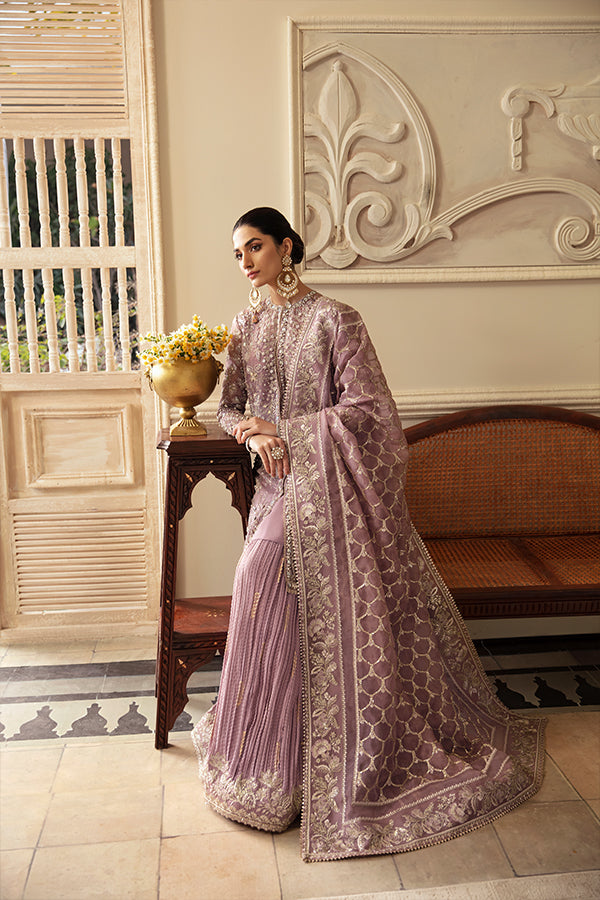A perfect embodiment of celebration, ?Sehr? a graceful ensemble, featuring the timeless charm of dusty mauve. This lavishly adorned Organza Jacket and airy drape dupatta with enchanting screen print, is skillfully adorned with intricate hand embellishments work, pairied with a Crushed Sharara, adding a touch of traditional work.