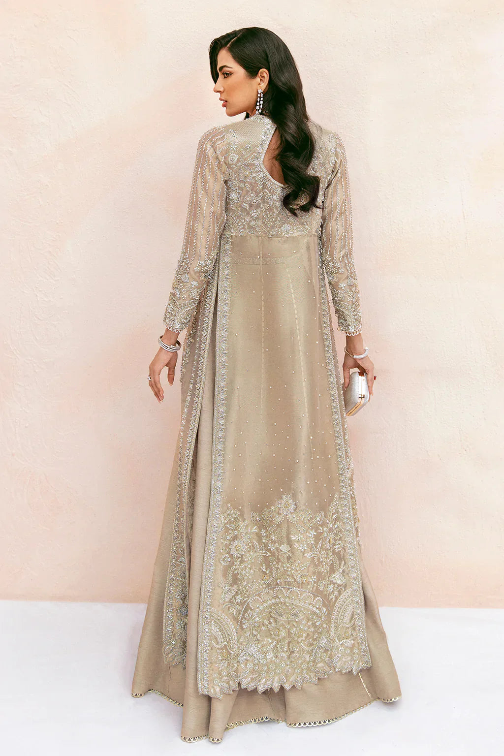 Dipped in golds and silvers this regal attire is a breath of fresh air for this wedding season. Blooming florals, meticulous hand-crafted modern patterns envisioned on a gold tissue base. Hand embroidered with lush gold and silver threads finished with elegant hand embellished crystals, delicately cut mirror pieces, sequins and gold zari. Paired with raw silk lehnga with lace stitching detail.