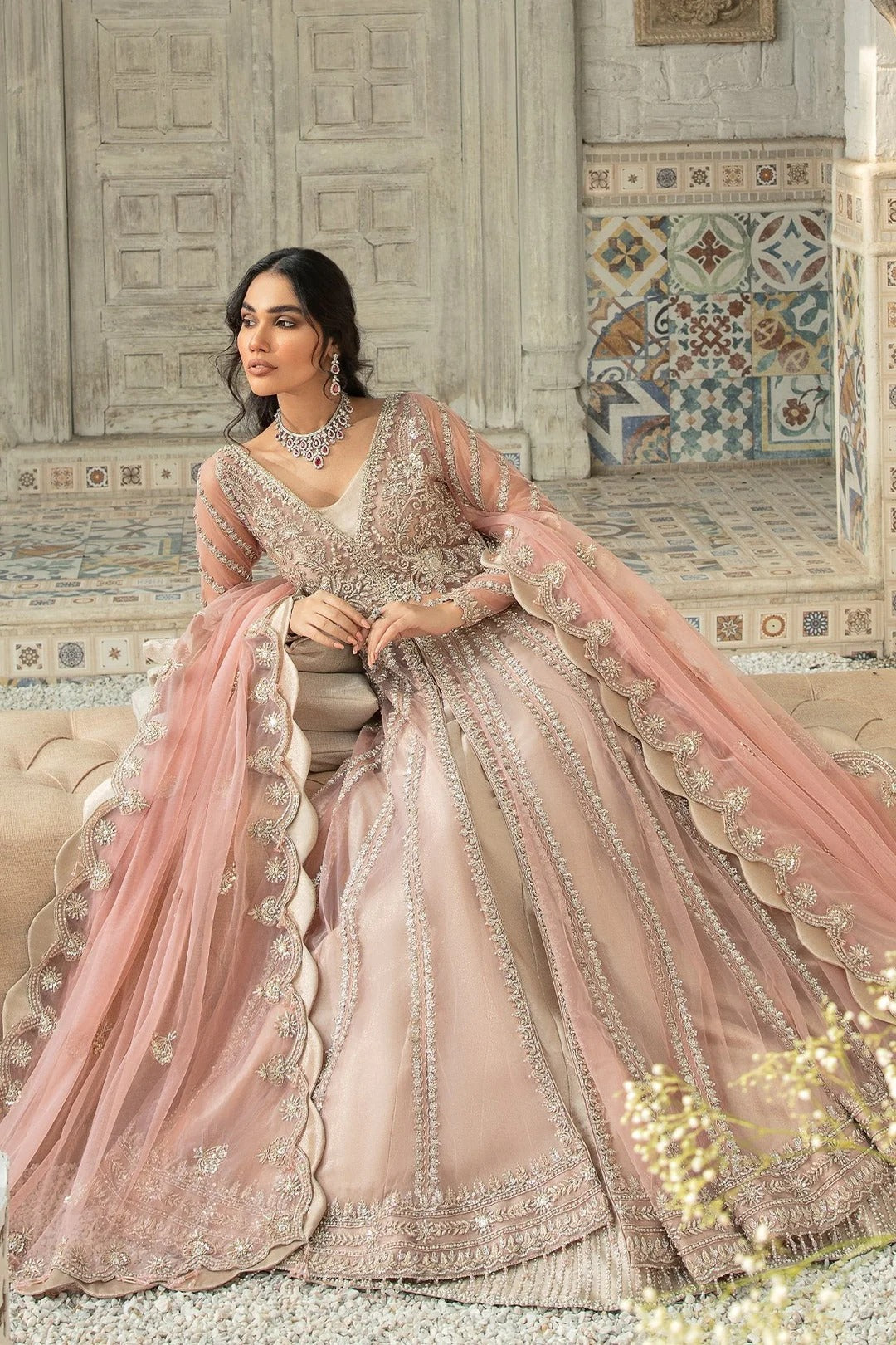 Description: Toe Kiss length blush pink Net gown embellished with dramatic merge of rose Gold and silver naqshi dabka floral pattern has no shortage of intricate hand work details. Oxidized rose Gold tone tissue lehnga crafted by highly skilled technique along four-sided hand embellished scalped running boarder on net dupatta complete the silhouette.